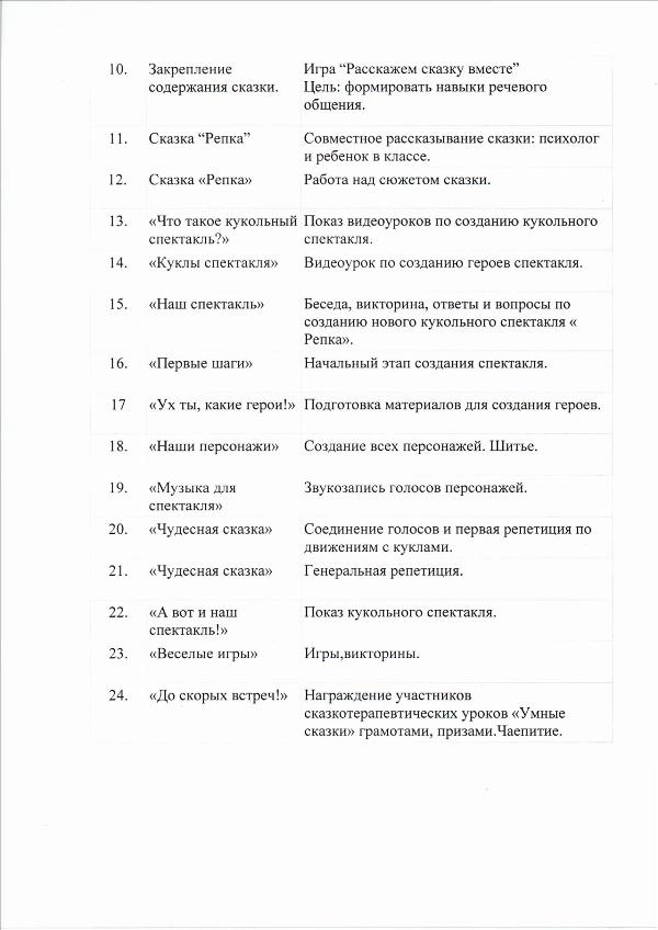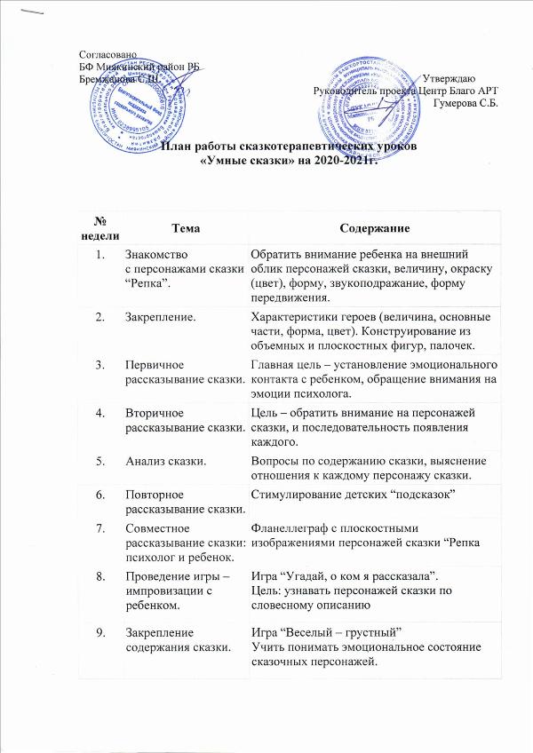 План работы сказкотерапевтических уроков "Умные сказки"